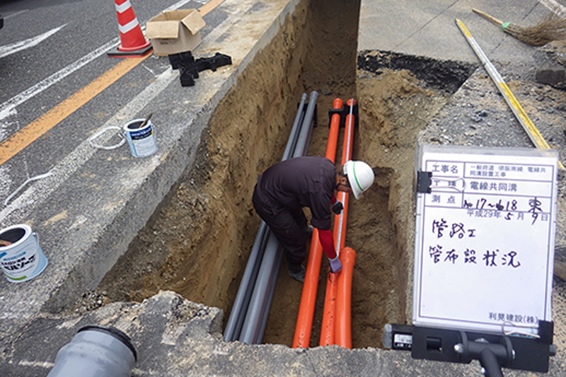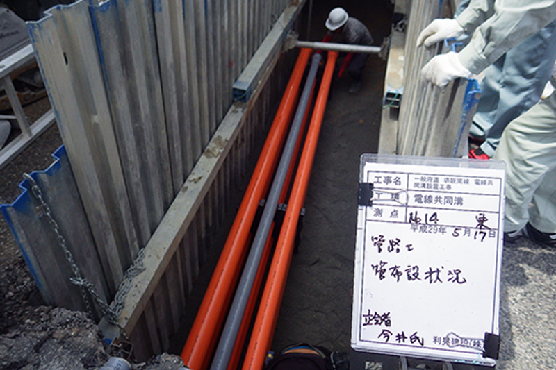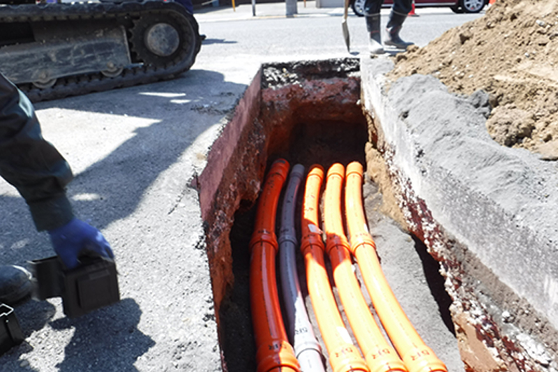 電線共同溝工事とは、都市の公共インフラ整備工事。道路上にある電柱や電線を地下に収容することで、快適な歩行空間の確保や都市景観の向上を図ることを目的としています。